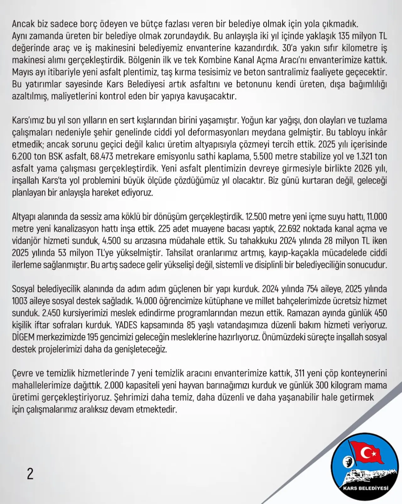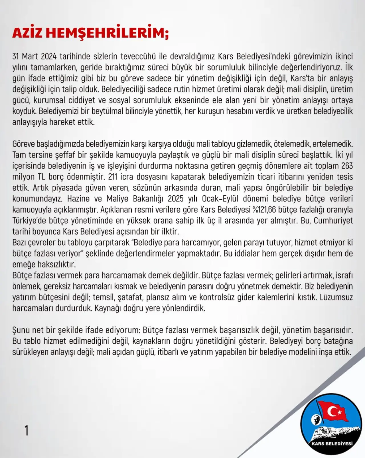 31 Mart 2024 tarihinde sizlerin teveccühü ile devraldığımız Kars Belediyesi’ndeki görevimizin ikinci yılını tamamlarken, geride bıraktığımız süreci büyük bir sorumluluk bilinciyle değerlendiriyoruz. İlk gün ifade ettiğimiz gibi biz bu göreve sadece bir yönetim değişikliği için değil, Kars’ta bir anlayış değişikliği için talip olduk. Belediyeciliği sadece rutin hizmet üretimi olarak değil; mali disiplin, üretim gücü, kurumsal ciddiyet ve sosyal sorumluluk ekseninde ele alan yeni bir yönetim anlayışı ortaya koyduk. Belediyemizi bir beytülmal bilinciyle yönettik, her kuruşun hesabını verdik ve üretken belediyecilik anlayışıyla hareket ettik.