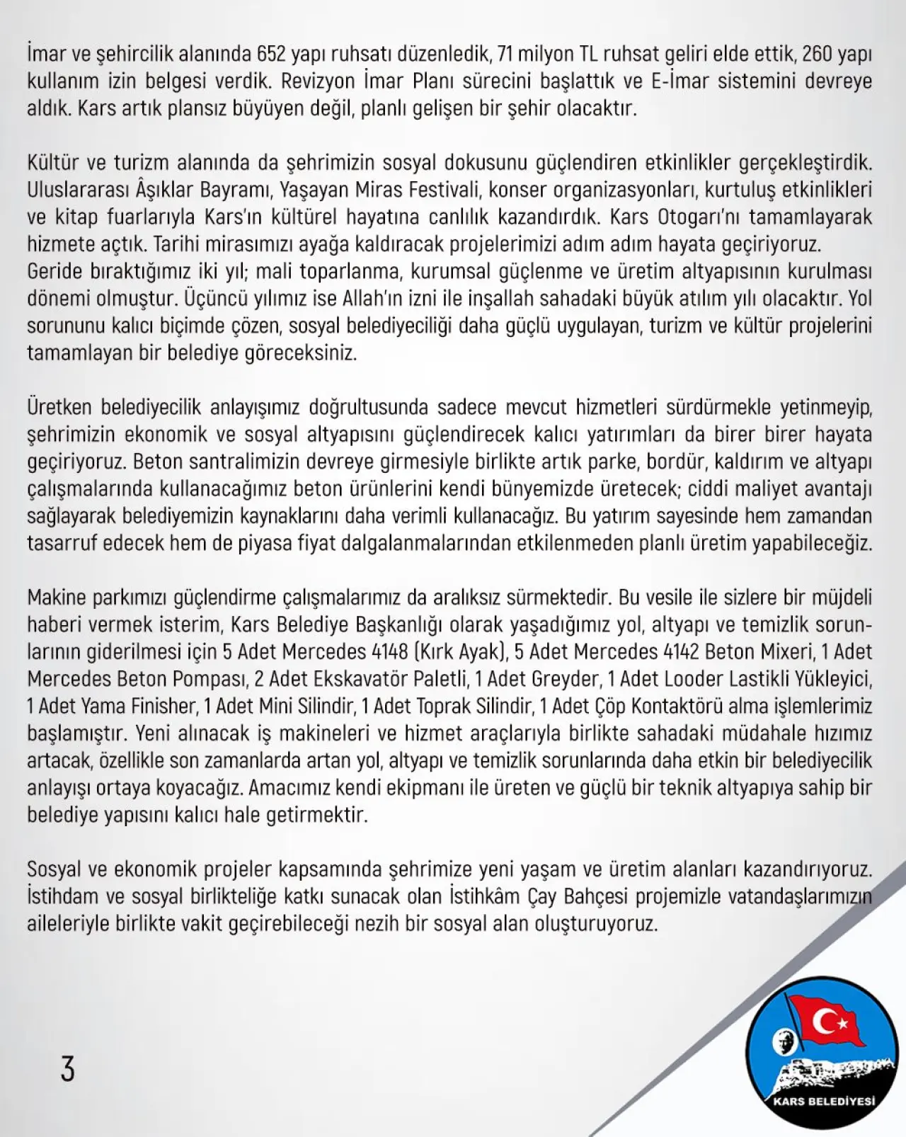 Makine parkımızı güçlendirme çalışmalarımız da aralıksız sürmektedir. Bu vesile ile sizlere bir müjdeli haberi vermek isterim, Kars Belediye Başkanlığı olarak yaşadığımız yol, altyapı ve temizlik sorunlarının giderilmesi için 5 Adet Mercedes 4148 (Kırk Ayak), 5 Adet Mercedes 4142 Beton Mixeri, 1 Adet Mercedes Beton Pompası, 2 Adet Ekskavatör Paletli, 1 Adet Greyder, 1 Adet Looder Lastikli Yükleyici, 1 Adet Yama Finisher, 1 Adet Mini Silindir, 1 Adet Toprak Silindir, 1 Adet Çöp Kontaktörü alma işlemlerimiz başlamıştır. Yeni alınacak iş makineleri ve hizmet araçlarıyla birlikte sahadaki müdahale hızımız artacak, özellikle son zamanlarda artan yol, altyapı ve temizlik sorunlarında daha etkin bir belediyecilik anlayışı ortaya koyacağız. Amacımız kendi ekipmanı ile üreten ve güçlü bir teknik altyapıya sahip bir belediye yapısını kalıcı hale getirmektir.