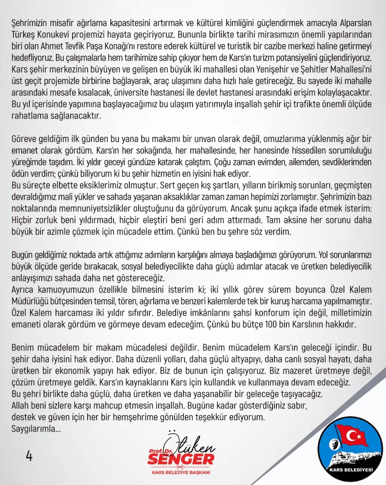 Ayrıca kamuoyumuzun özellikle bilmesini isterim ki; iki yıllık görev sürem boyunca Özel Kalem Müdürlüğü bütçesinden temsil, tören, ağırlama ve benzeri kalemlerde tek bir kuruş harcama yapılmamıştır. Özel Kalem harcaması iki yıldır sıfırdır. Belediye imkânlarını şahsi konforum için değil, milletimizin emaneti olarak gördüm ve görmeye devam edeceğim. Çünkü bu bütçe 100 bin Karslının hakkıdır.