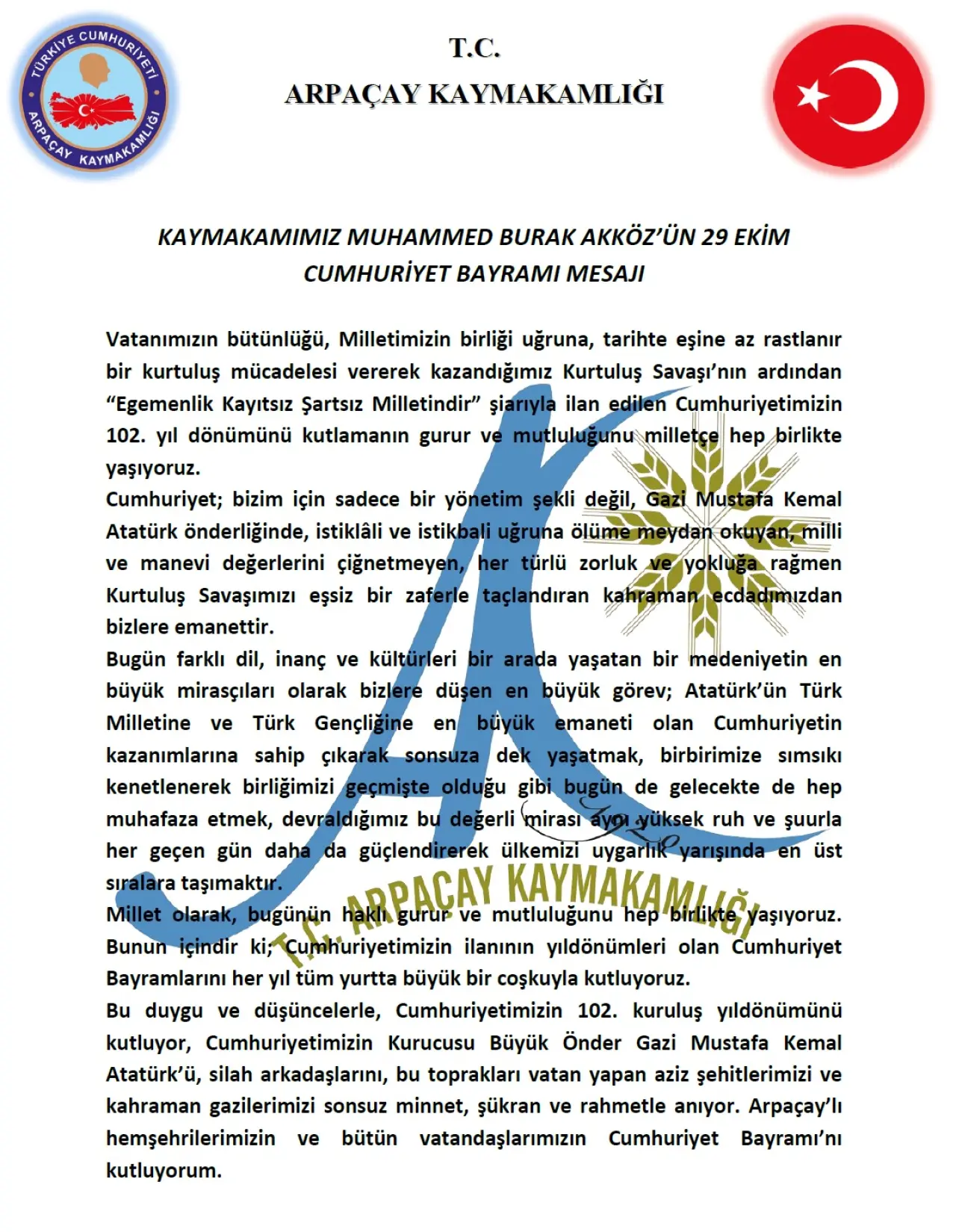 Arpaçay Kaymakamı Muhammed Burak Akköz, 29 Ekim Cumhuriyet Bayramı'nda Cumhuriyetin 102. yılı dolayısıyla milletin birlik ve beraberliğini vurguladı.