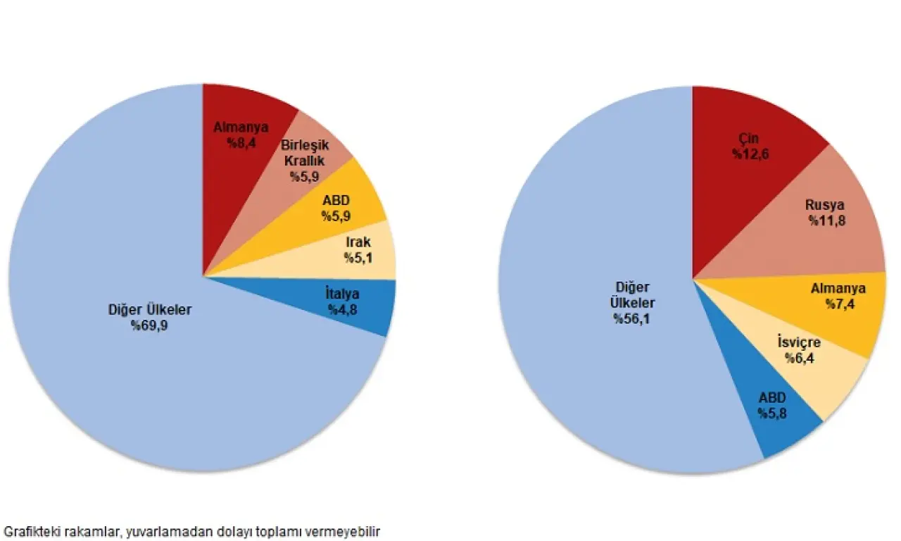 İthalatta ilk sırayı Çin aldı. Ekim ayında Çin’den yapılan ithalat 3 milyar 977 milyon dolar olurken, bu ülkeyi 3 milyar 712 milyon dolar ile Rusya Federasyonu, 2 milyar 326 milyon dolar ile Almanya, 2 milyar 5 milyon dolar ile İsviçre ve 1 milyar 828 milyon dolar ile ABD izledi. İlk 5 ülkeden yapılan ithalat toplamın %43,9’unu oluşturdu.
