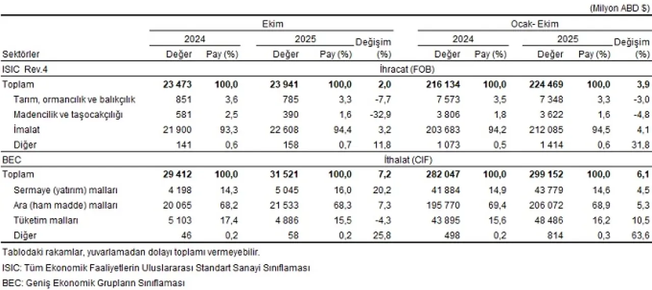 Türkiye İstatistik Kurumu ile Ticaret Bakanlığı iş birliğiyle genel ticaret sistemi kapsamında üretilen geçici dış ticaret verilerine göre; ihracat 2025 yılı Ekim ayında, bir önceki yılın aynı ayına göre %2,0 artarak 23 milyar 941 milyon dolar, ithalat %7,2 artarak 31 milyar 521 milyon dolar olarak gerçekleşti.