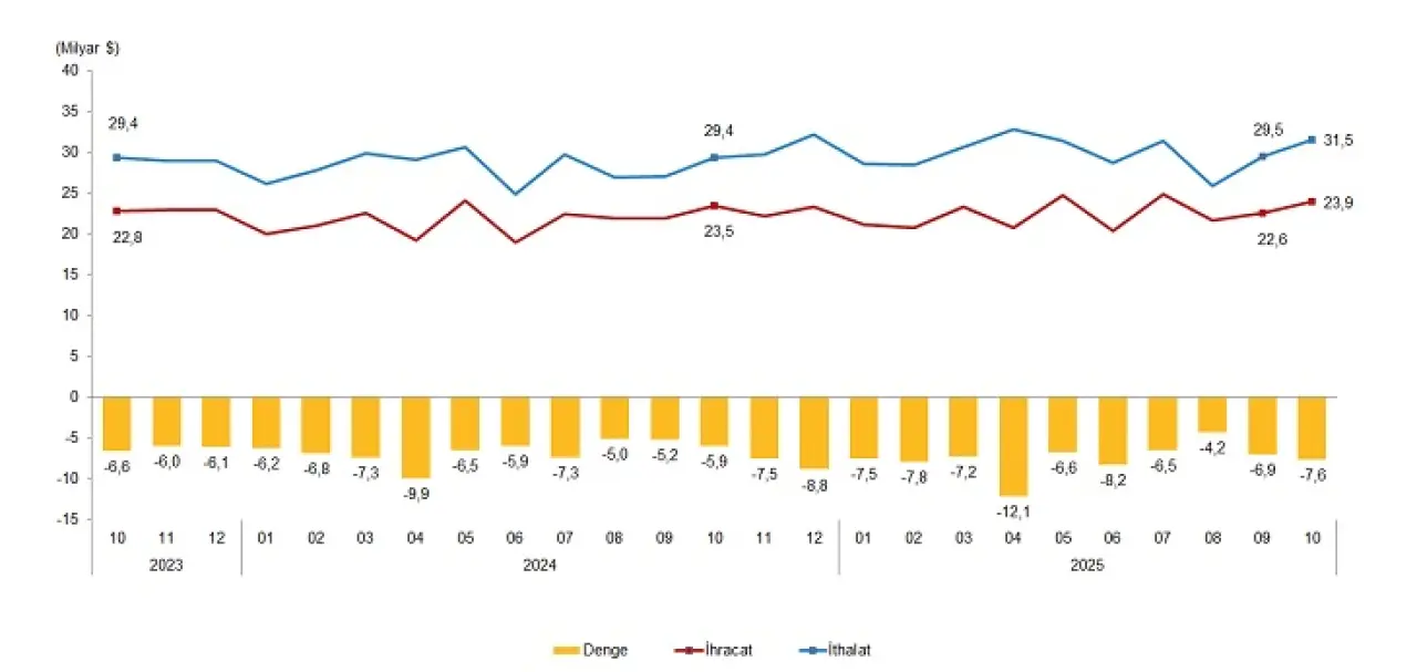 2025 yılı Ocak-Ekim döneminde özel ticaret sistemine göre ihracat %4,2 artarak 203 milyar 993 milyon dolar, ithalat %6,9 artarak 280 milyar 748 milyon dolar oldu. Dış ticaret açığı %14,9 artarak 66 milyar 775 milyon dolardan 76 milyar 755 milyon dolara yükseldi. İhracatın ithalatı karşılama oranı %72,7 olarak gerçekleşti.