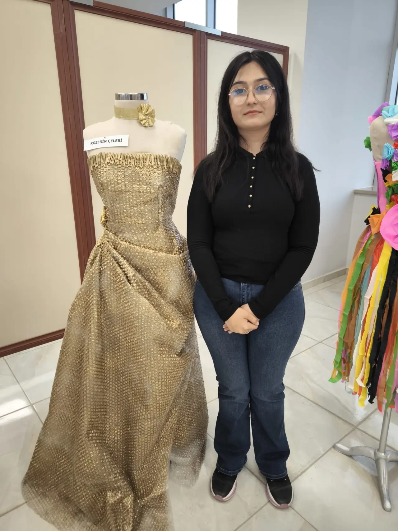 Hayrunisa Çakır, çöp poşeti ve alüminyum folyo ile tasarım yaptığını belirterek, “Beden kalıbını oluşturduktan sonra üstünü folyo ile kapladım. Çiçek detayları ile süsledim, çöpe gitmemesi için özel süslemeler ekledim.” dedi.