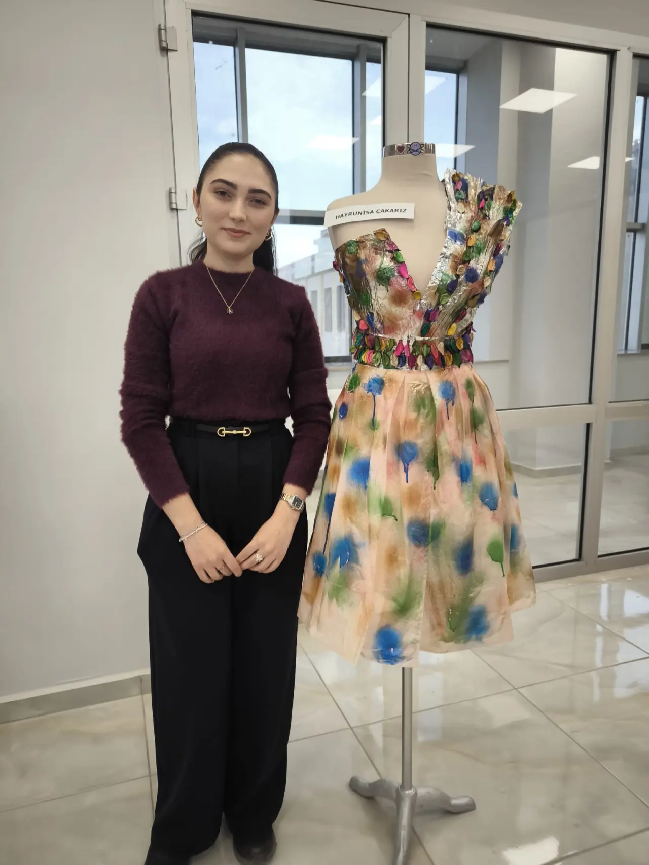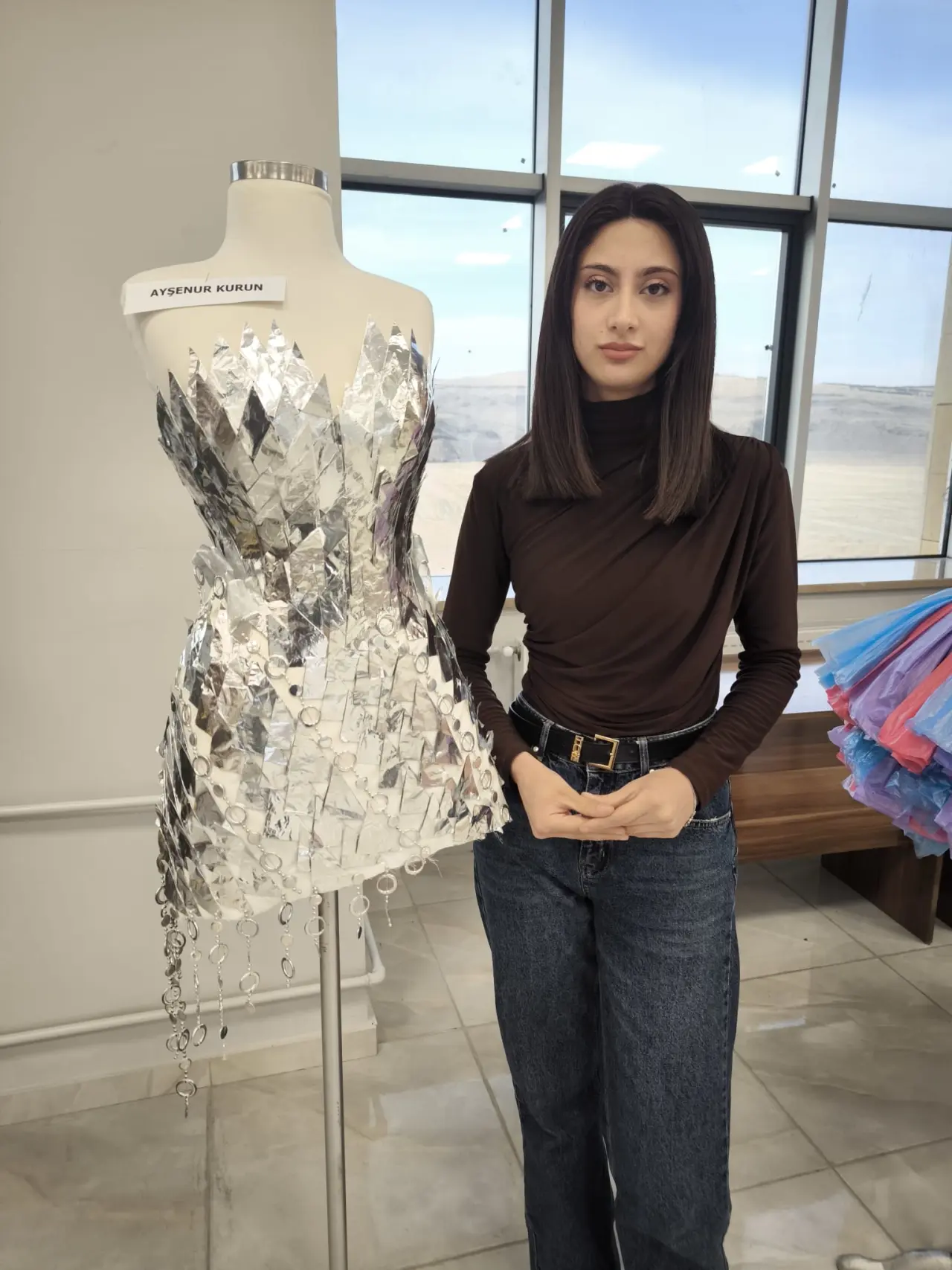 Hicaz Erdoğdu, yurtta kalan ve pet şişe kapaklarıyla tasarım yaptığını belirterek, “Toplam 250 kapak kullandım. Elbisemin altına astar yaptım ve kapakları silikonla yapıştırdım. Bu ürünlerde modanın bir sanat ve geri dönüşümün de bir sanat olgunluğu olduğunu vurgulamak istedim.” ifadelerini kullandı.