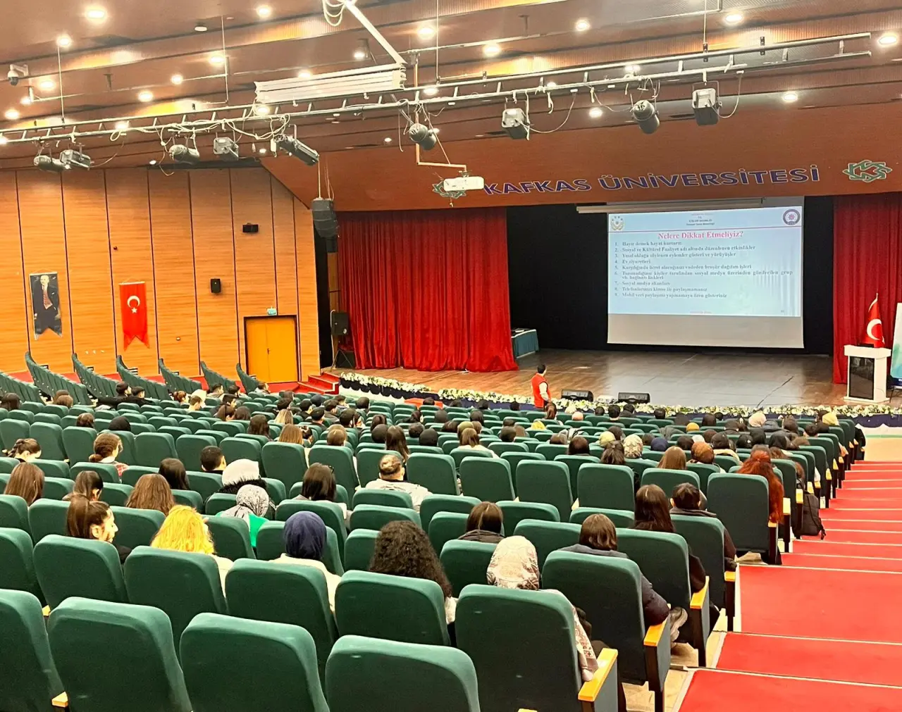 2025–2026 akademik yılı kapsamında hazırlık ve birinci sınıf öğrencilerine verilen eğitimlerde; terör, terör örgütlerinin yöntemleri, gençleri hedef alma çalışmaları, Kars’ın risk durumu ve alınması gereken kişisel güvenlik önlemleri anlatıldı.