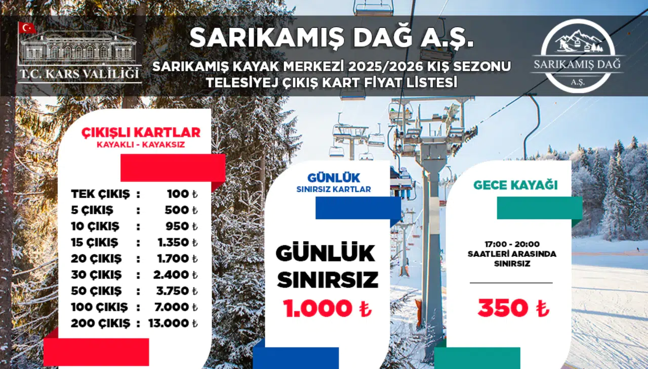Sarıkamış Dağ AŞ tarafından yapılan açıklamaya göre, yeni sezon için geçerli olacak telesiyej çıkış kart ücretleri kamuoyu ile paylaşıldı. Açıklanan fiyat listesine göre Sarıkamış Kayak Merkezi’nde günlük sınırsız skipass ücreti kişi başı 1000 TL olarak belirlendi.